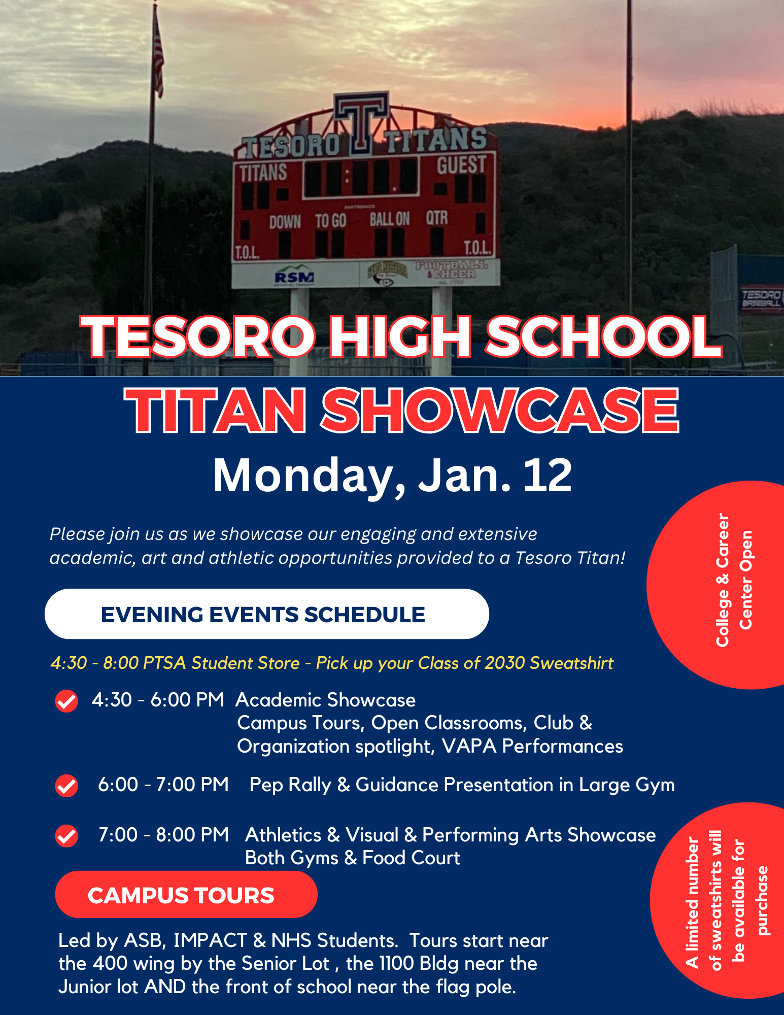 - Monday, January 12, 2026 - Titan Showcase from 4:30pm - 8:00pm.